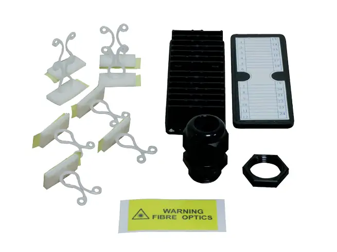 Kit para la gestión de cables en los paneles 19” y cajas de terminación de fibra óptica. Mantiene de una manera correcta y ordenada el sobrante de fibra y los protectores de fusión.